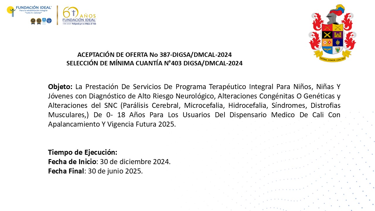 Objeto: La Prestación De Servicios De Programa Terapéutico Integral Para Niños, Niñas Y Jóvenes con Diagnóstico de Alto Riesgo Neurológico, Alteraciones Congénitas O Genéticas y Alteraciones del SNC (Parálisis Cerebral, Microcefalia, Hidrocefalia, Síndromes, Distrofias Musculares,) De 0- 18 Años Para Los Usuarios Del Dispensario Medico De Cali Con Apalancamiento Y Vigencia Futura 2025.