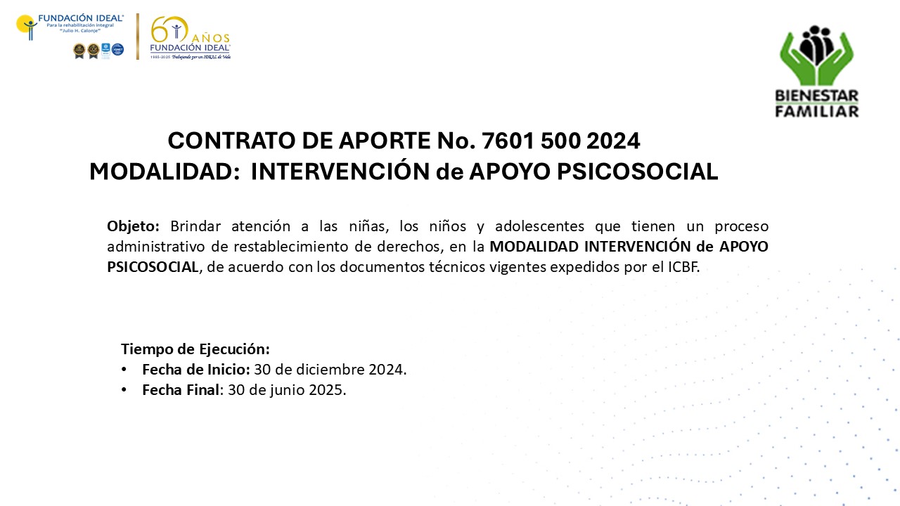 Objeto: Brindar atención a las niñas, los niños y adolescentes que tienen un proceso administrativo de restablecimiento de derechos, en la MODALIDAD INTERVENCIÓN de APOYO PSICOSOCIAL, de acuerdo con los documentos técnicos vigentes expedidos por el ICBF.
