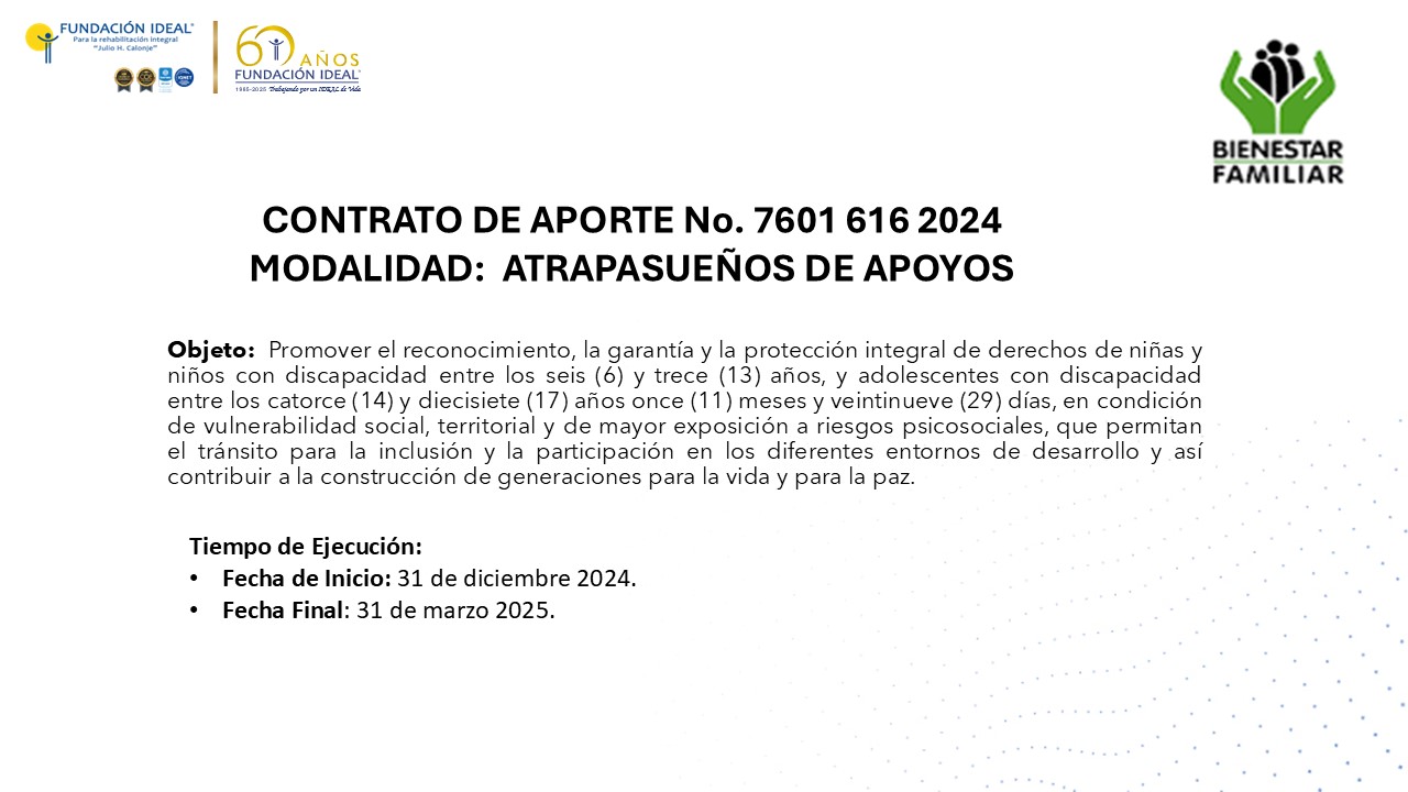 Objeto: Promover el reconocimiento, la garantía y la protección integral de derechos de niñas y niños con discapacidad entre los seis (6) y trece (13) años, y adolescentes con discapacidad entre los catorce (14) y diecisiete (17) años once (11) meses y veintinueve (29) días, en condición de vulnerabilidad social, territorial y de mayor exposición a riesgos psicosociales, que permitan el tránsito para la inclusión y la participación en los diferentes entornos de desarrollo y así contribuir a la construcción de generaciones para la vida y para la paz.