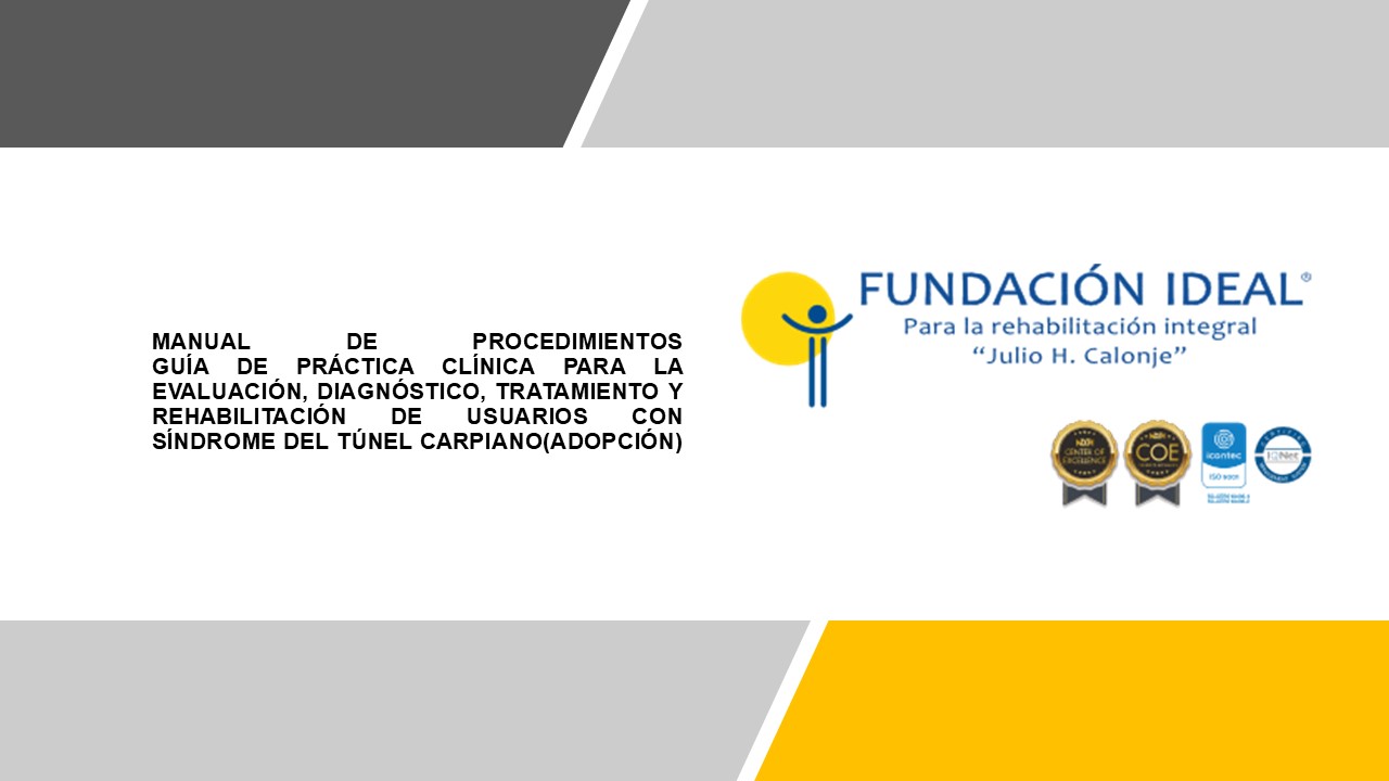 Las recomendaciones de esta Guía han sido traducidas y adoptadas de la Guía: Management of Carpal Tunnel Syndrome Evidence-Based Clinical Practice Guideline [1], disponible en: https://www.aaos.org/globalassets/quality-and-practice-resources/carpal-tunnel/cts_cpg_4-25-19.pdf Las recomendaciones corresponden con el nivel de complejidad y con los programas que oferta la Fundación IDEAL®. Se incorporaron recomendaciones de otras fuentes que eran relevantes para el contexto institucional y no se encontraban disponibles en la GPC seleccionada para el proceso de adopción. Este documento no ha sido revisado o aprobado por las entidades que desarrollaron la Guía o autores de fuentes originales para asegurar que la redacción de sus recomendaciones refleje de manera precisa la publicación original. El contenido de esta Guía es para uso exclusivo en Fundación IDEAL®.